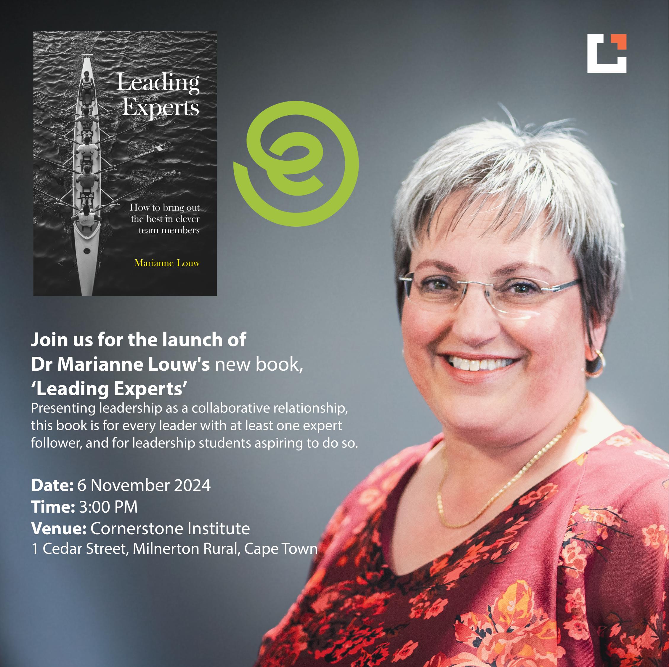 Cape Town, 15 October 2024 – Cornerstone Institute is proud to announce the launch of Leading Experts, a new book by Dr Marianne Louw, Executive Dean at Cornerstone Institute, on 6 November 2024. The event will be held at the Cornerstone Institute campus and will engage leaders, students, and anyone interested in improving their leadership skills in today’s workplace.